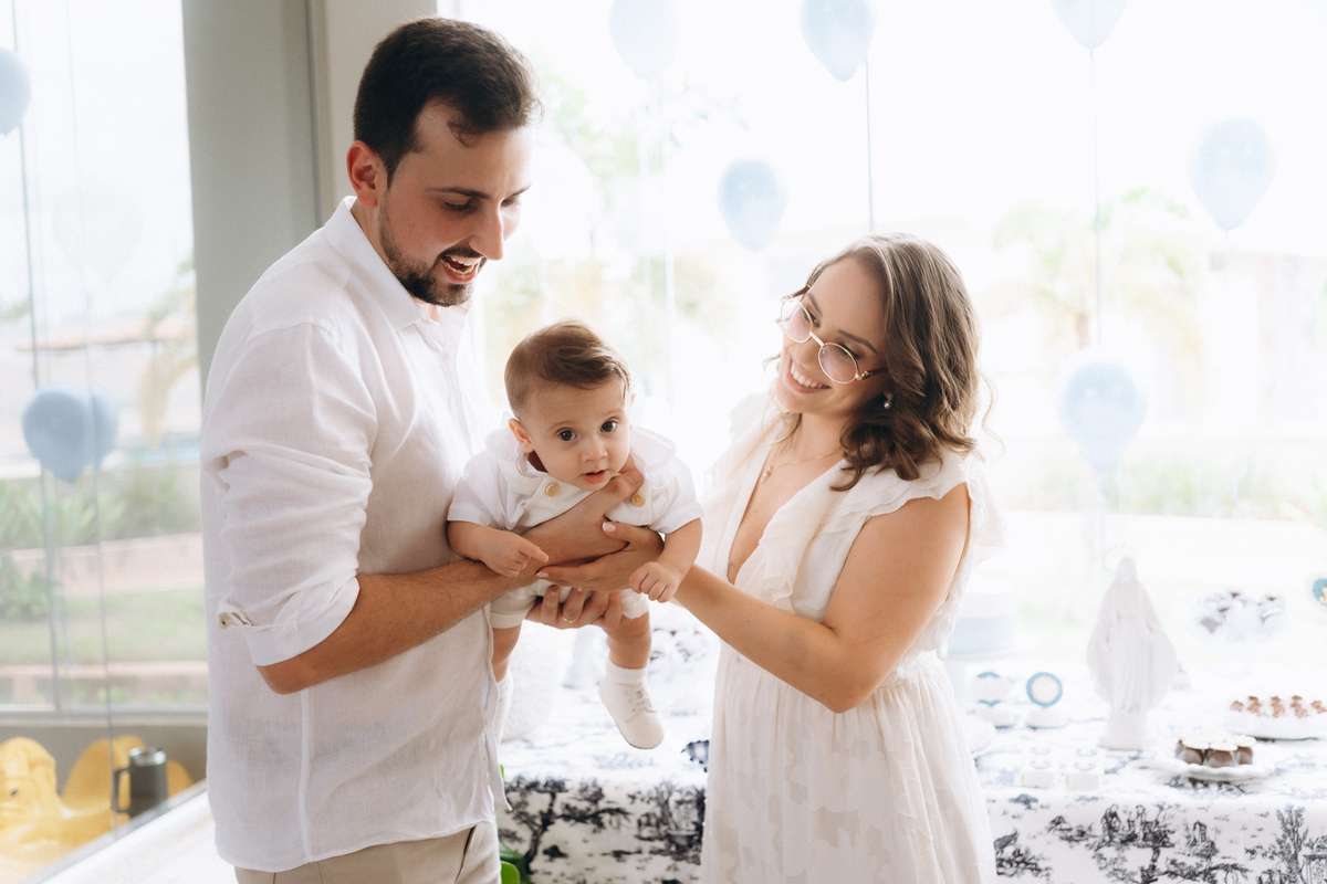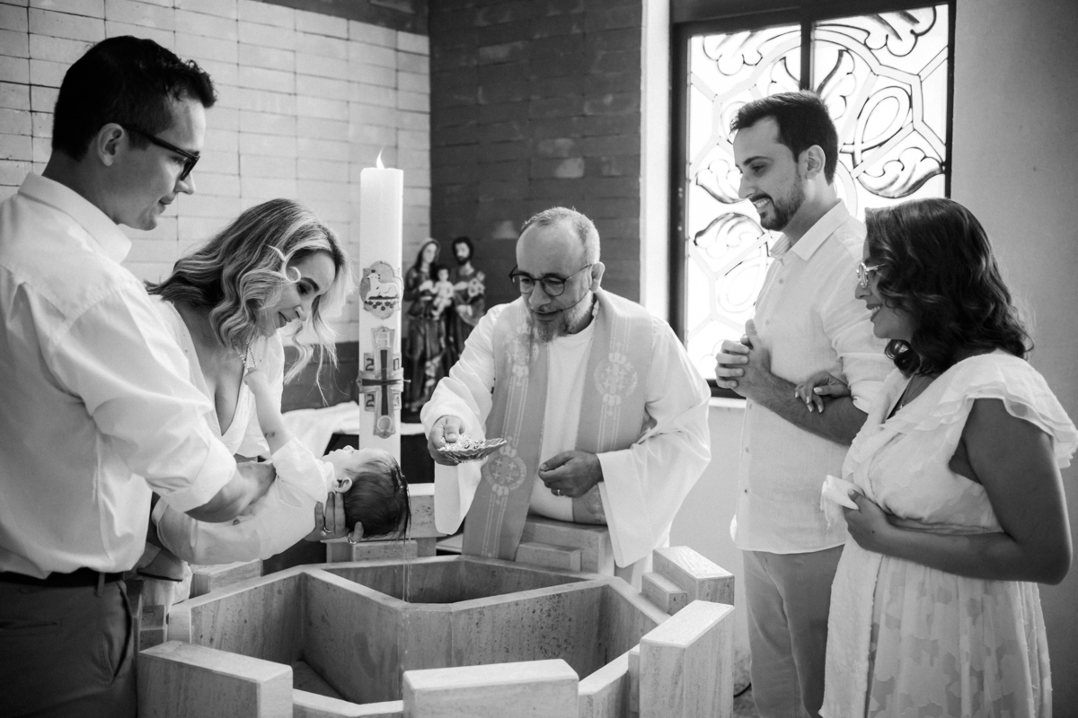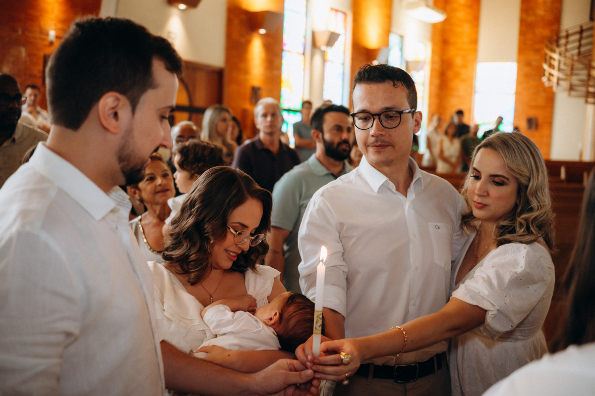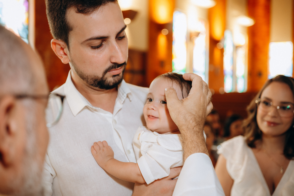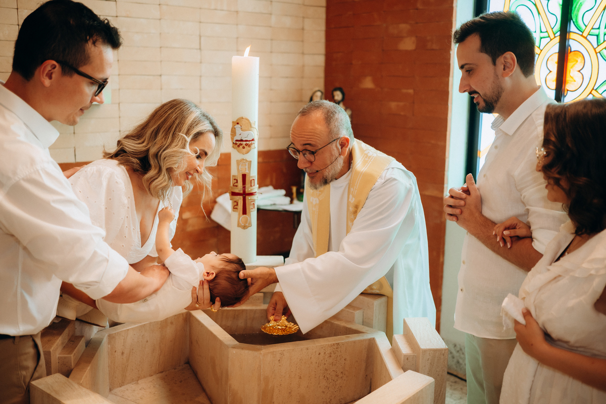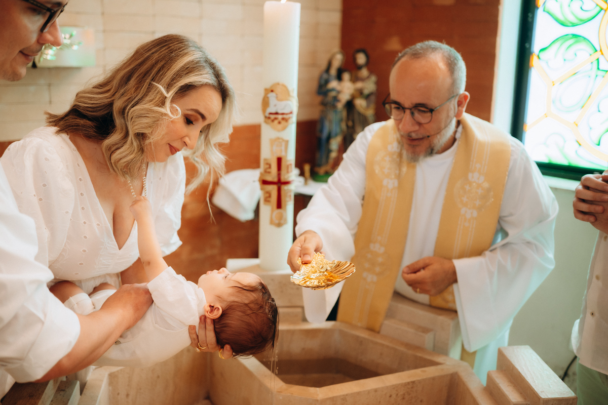 o toque delicado da água benta, o colo seguro da mamãe Mari, o olhar orgulhoso do papai Matheus e os gestos de carinho da família.
