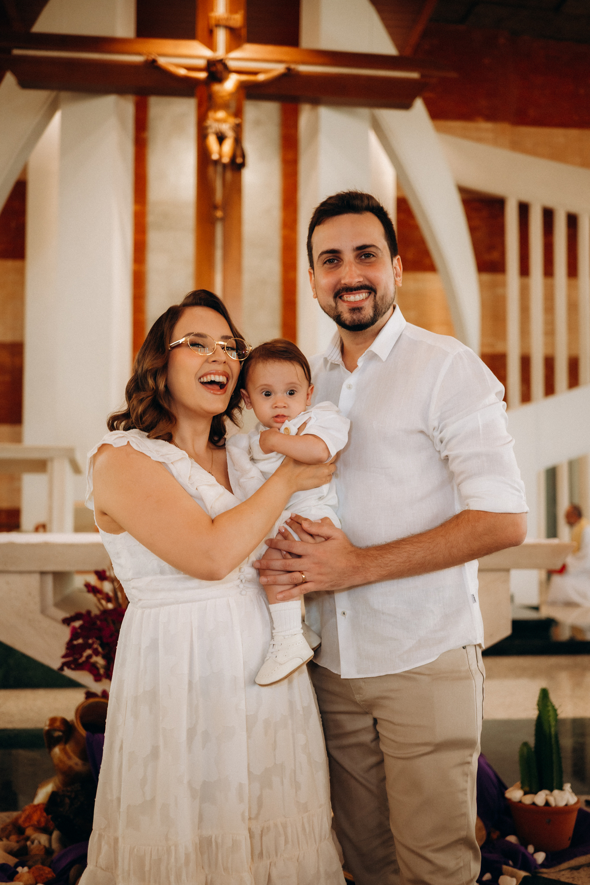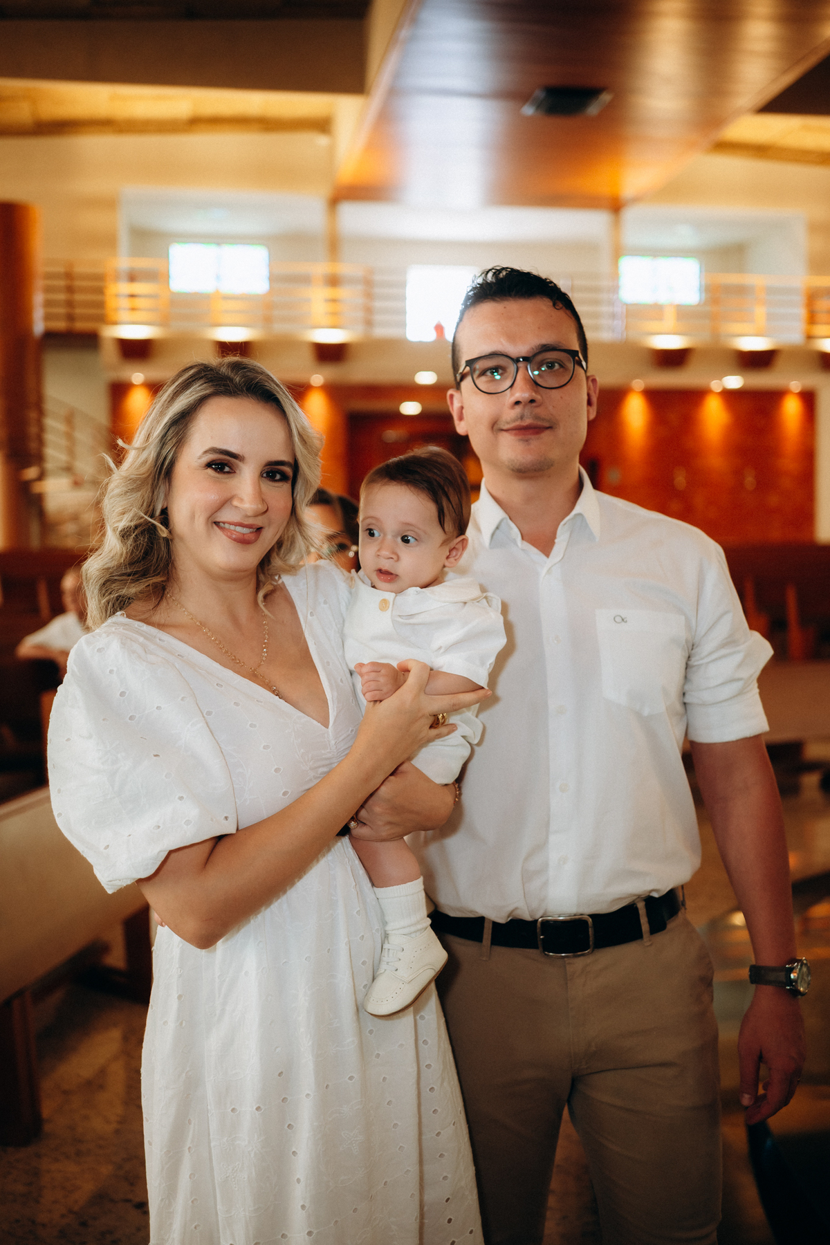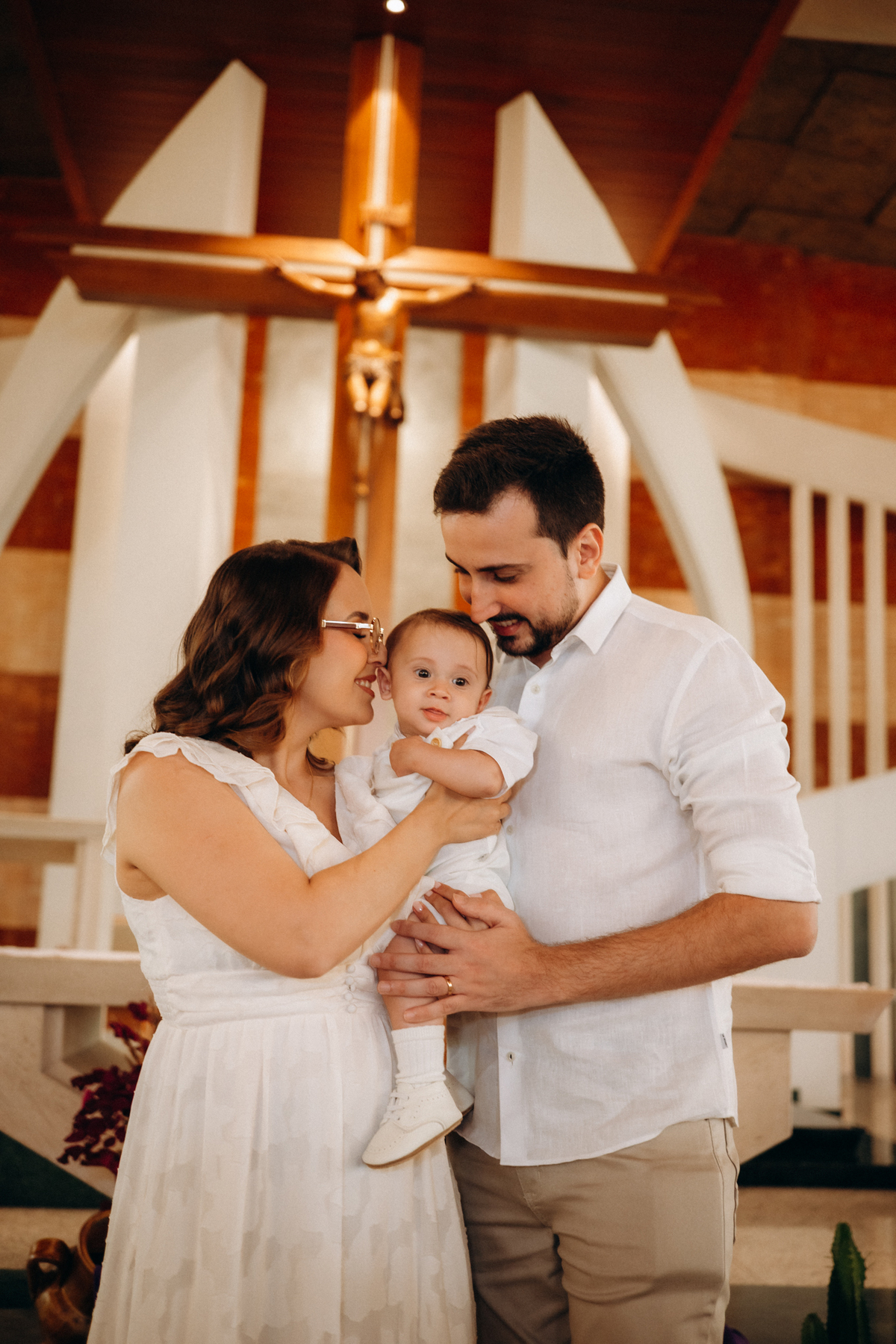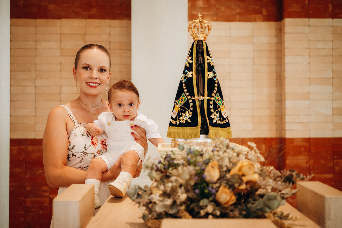 o toque delicado da água benta, o colo seguro da mamãe Mari, o olhar orgulhoso do papai Matheus e os gestos de carinho da família.