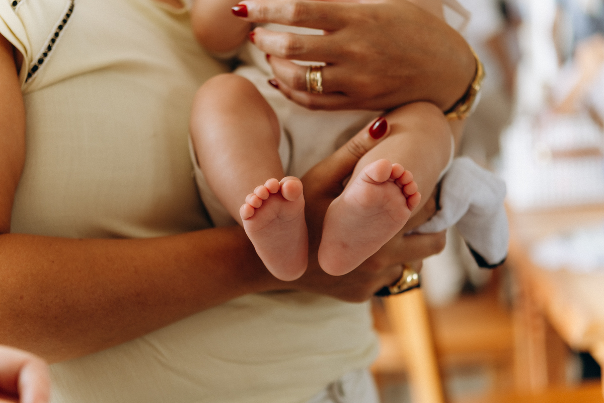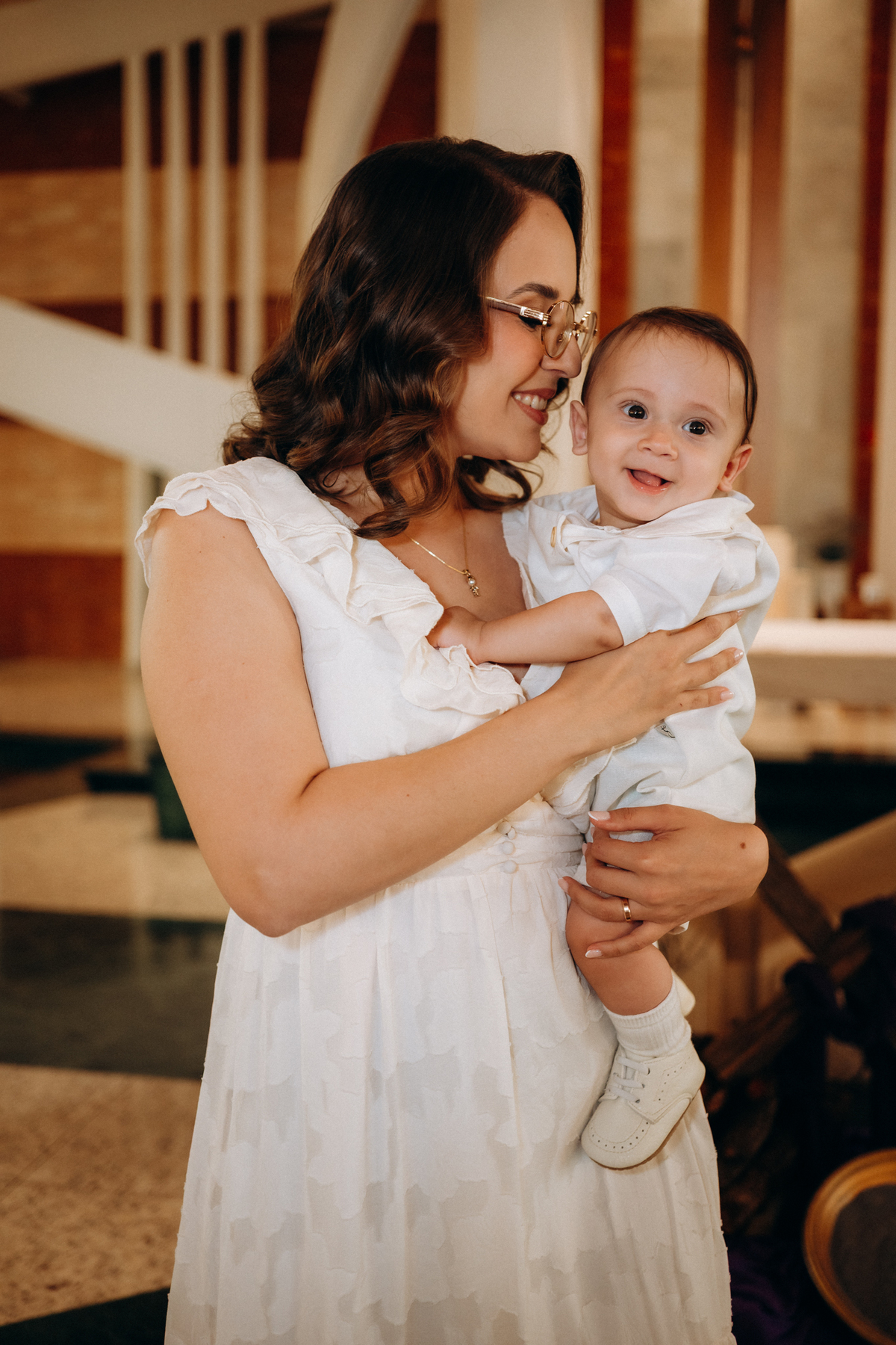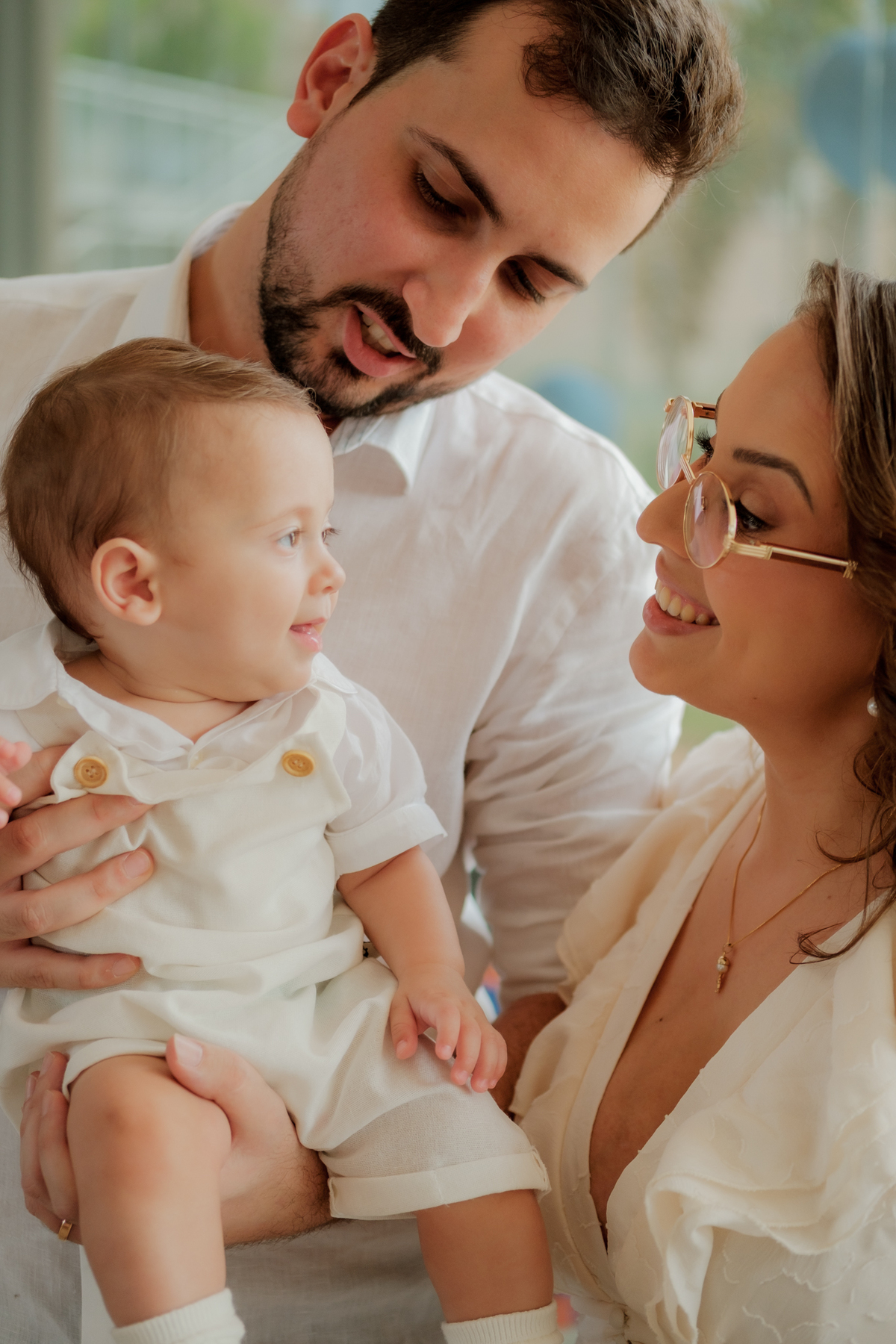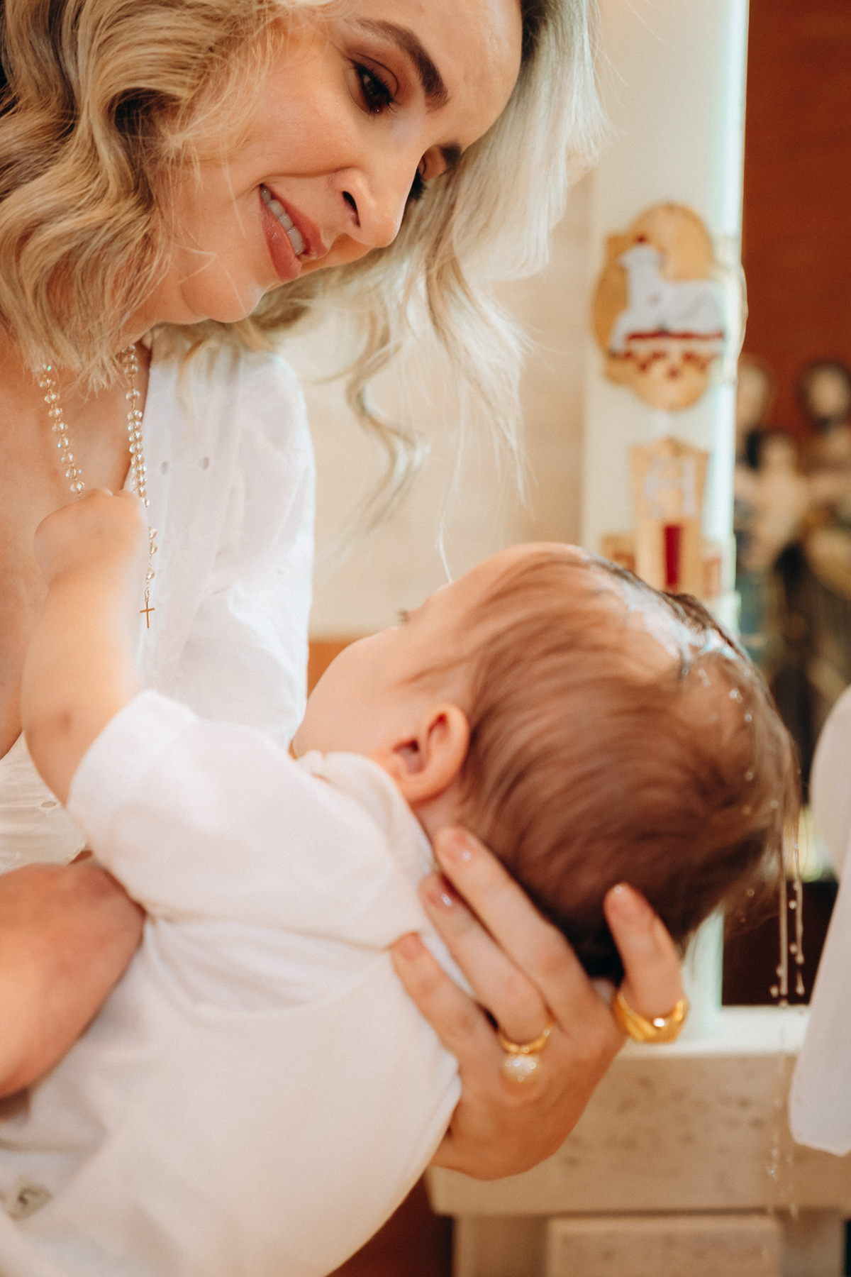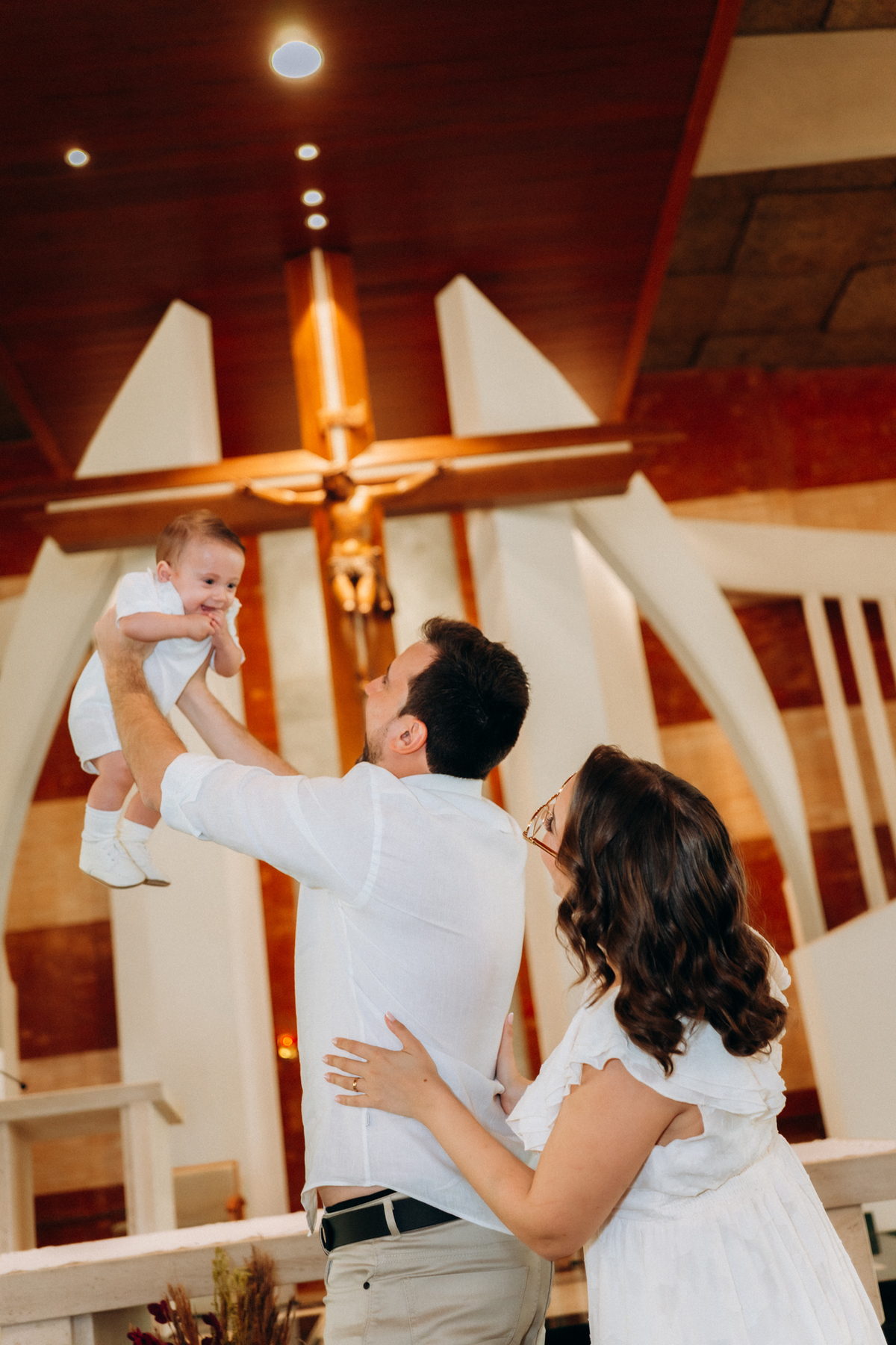 o toque delicado da água benta, o colo seguro da mamãe Mari, o olhar orgulhoso do papai Matheus e os gestos de carinho da família.