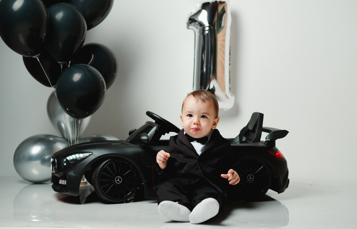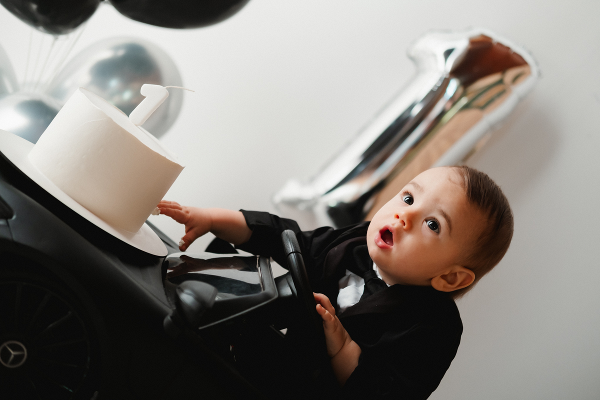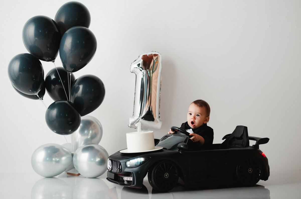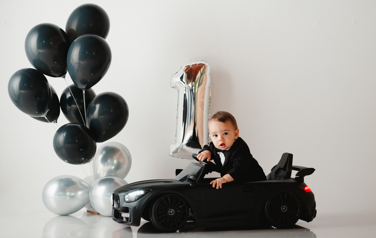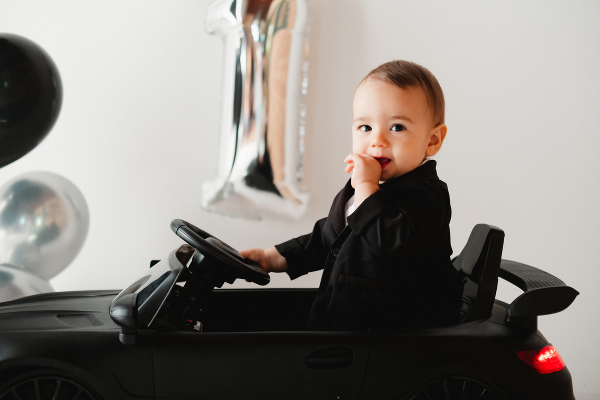 Para o ensaio, ela escolheu dois temas encantadores para a festa infantil de 1 ano. O primeiro foi inspirado no estilo Poderoso Chefinho, com uma proposta elegante e divertida, onde o Noah apareceu super charmoso em seu terninho dirigindo um carrinho, trazendo toda a personalidade de um pequeno “chefinho”. O cenário com balões e o número 1 marcou de forma delicada essa data tão importante.