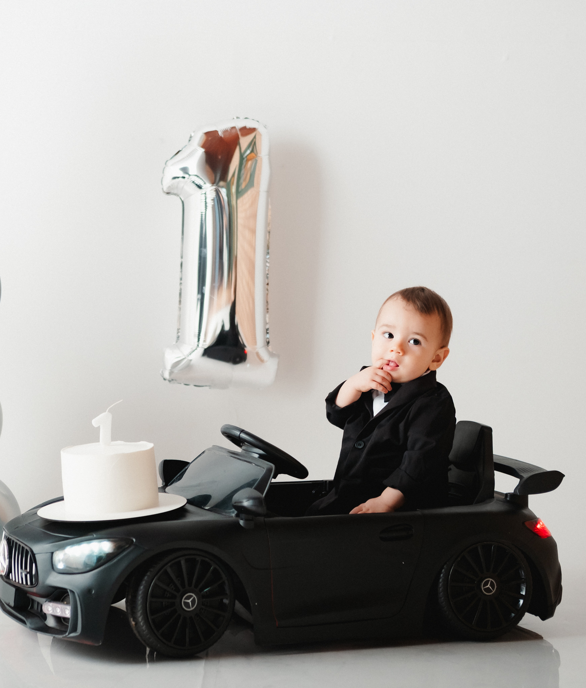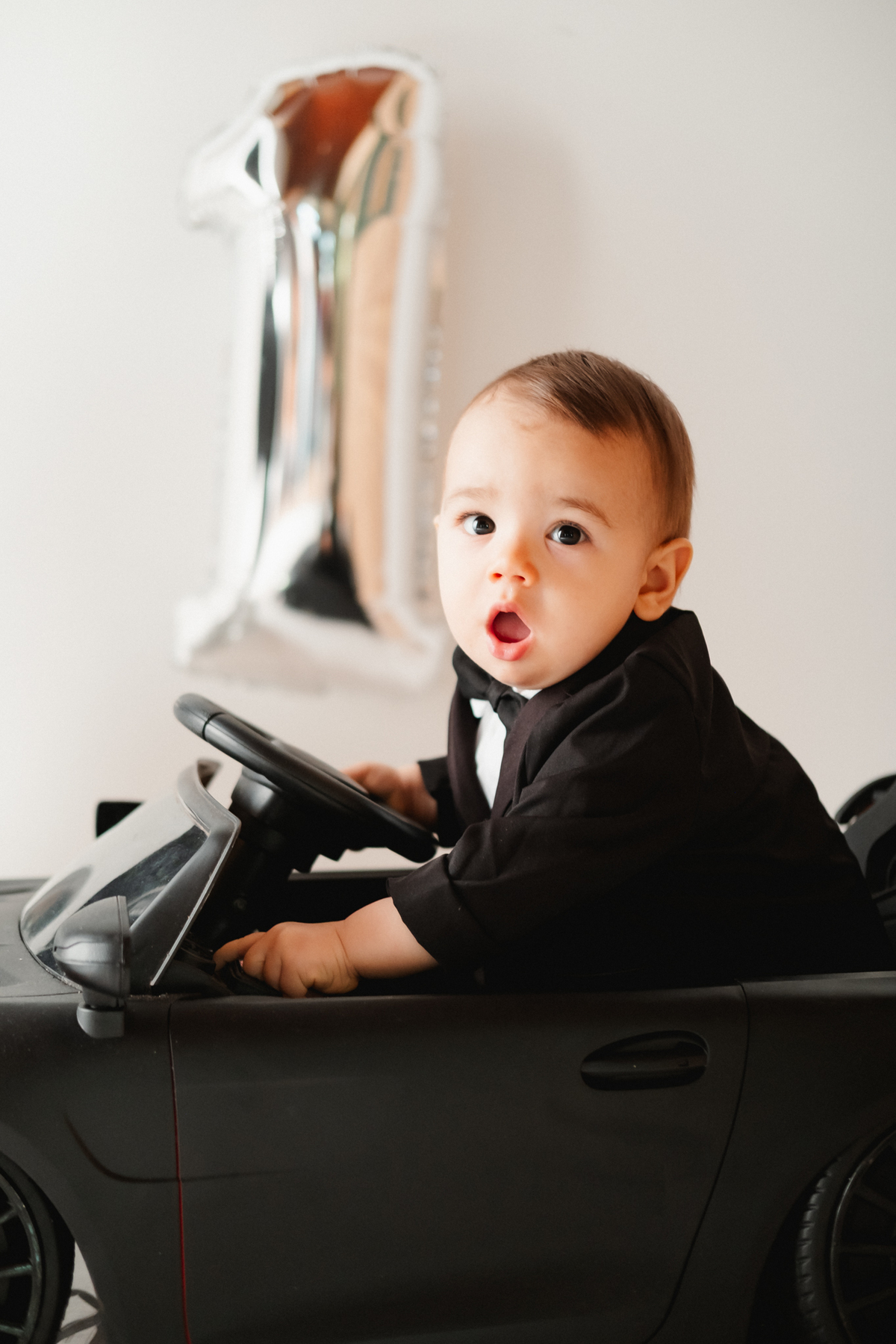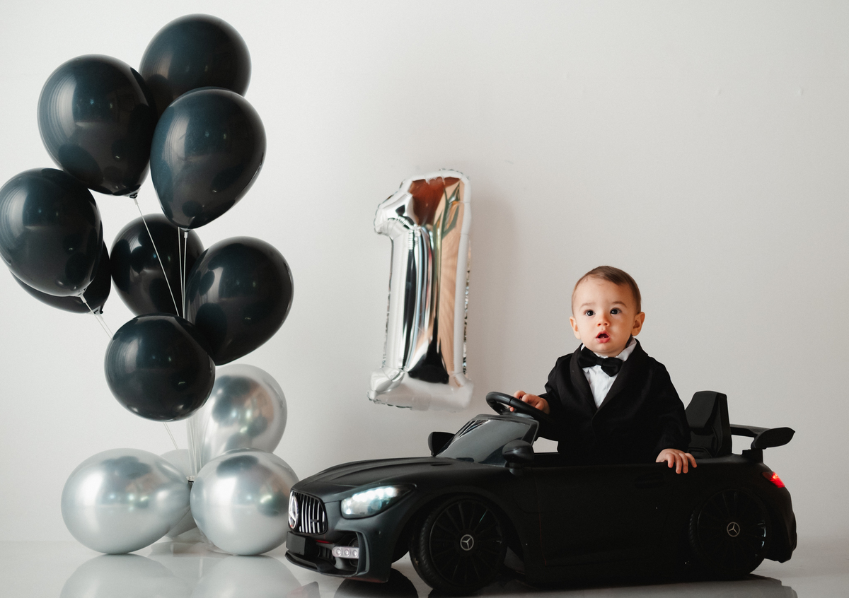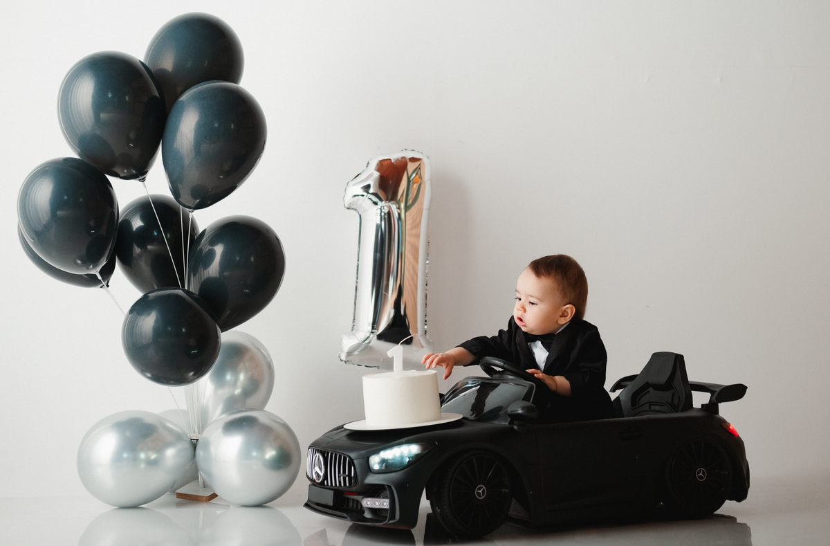 Para o ensaio, ela escolheu dois temas encantadores para a festa infantil de 1 ano. O primeiro foi inspirado no estilo Poderoso Chefinho, com uma proposta elegante e divertida, onde o Noah apareceu super charmoso em seu terninho dirigindo um carrinho, trazendo toda a personalidade de um pequeno “chefinho”. O cenário com balões e o número 1 marcou de forma delicada essa data tão importante.