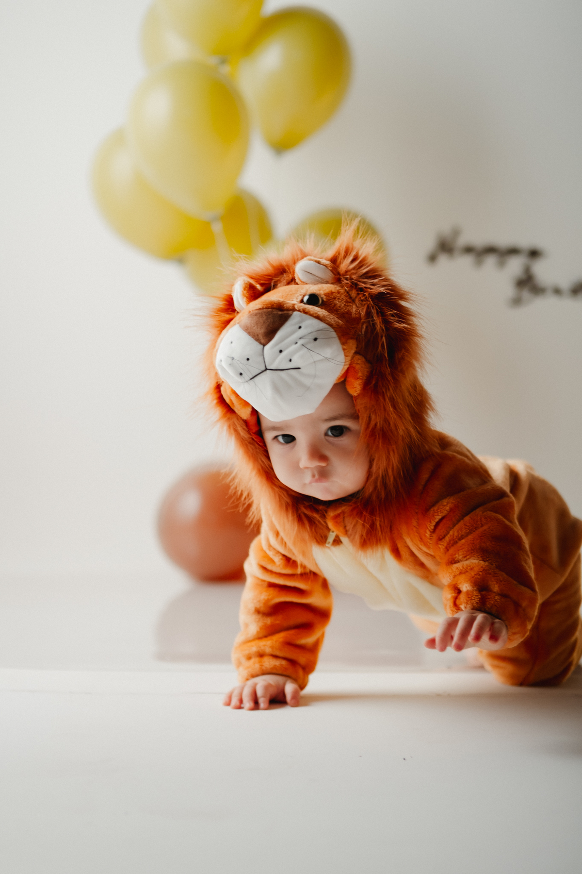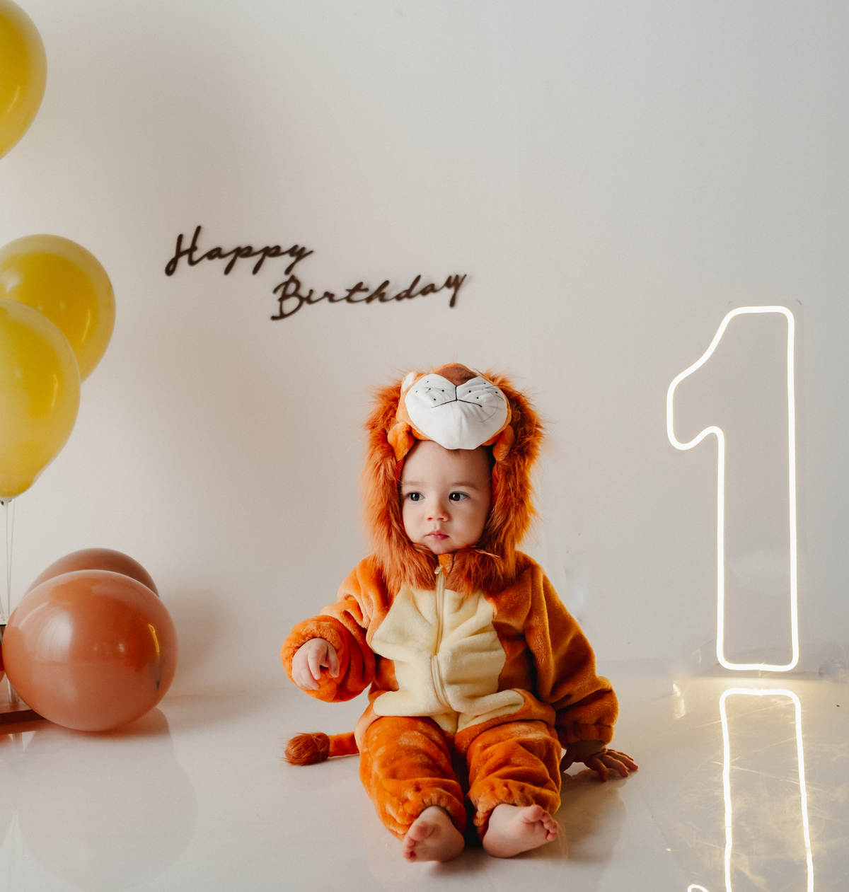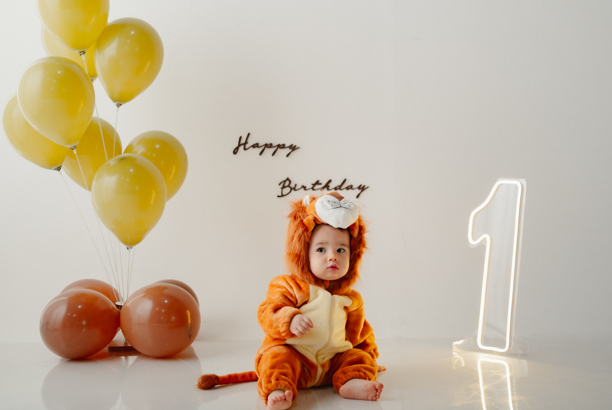O segundo tema foi inspirado no clássico Rei Leão, trazendo uma atmosfera lúdica e cheia de fofura. Noah apareceu com uma fantasia de leão, em um cenário delicado com balões e elementos que remetem à natureza, perfeito para quem busca ideias criativas para festa de 1 ano tema Rei Leão.