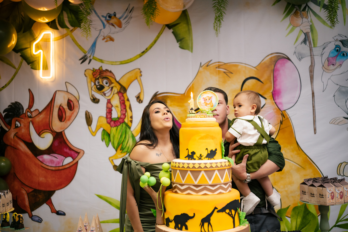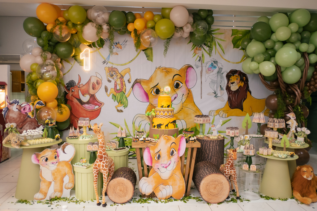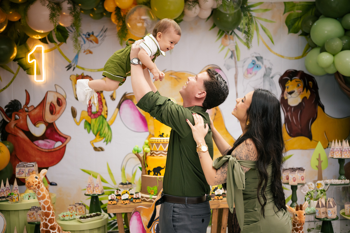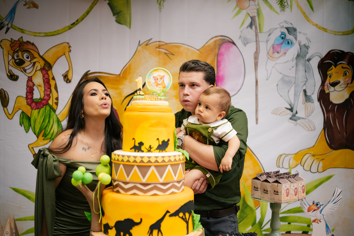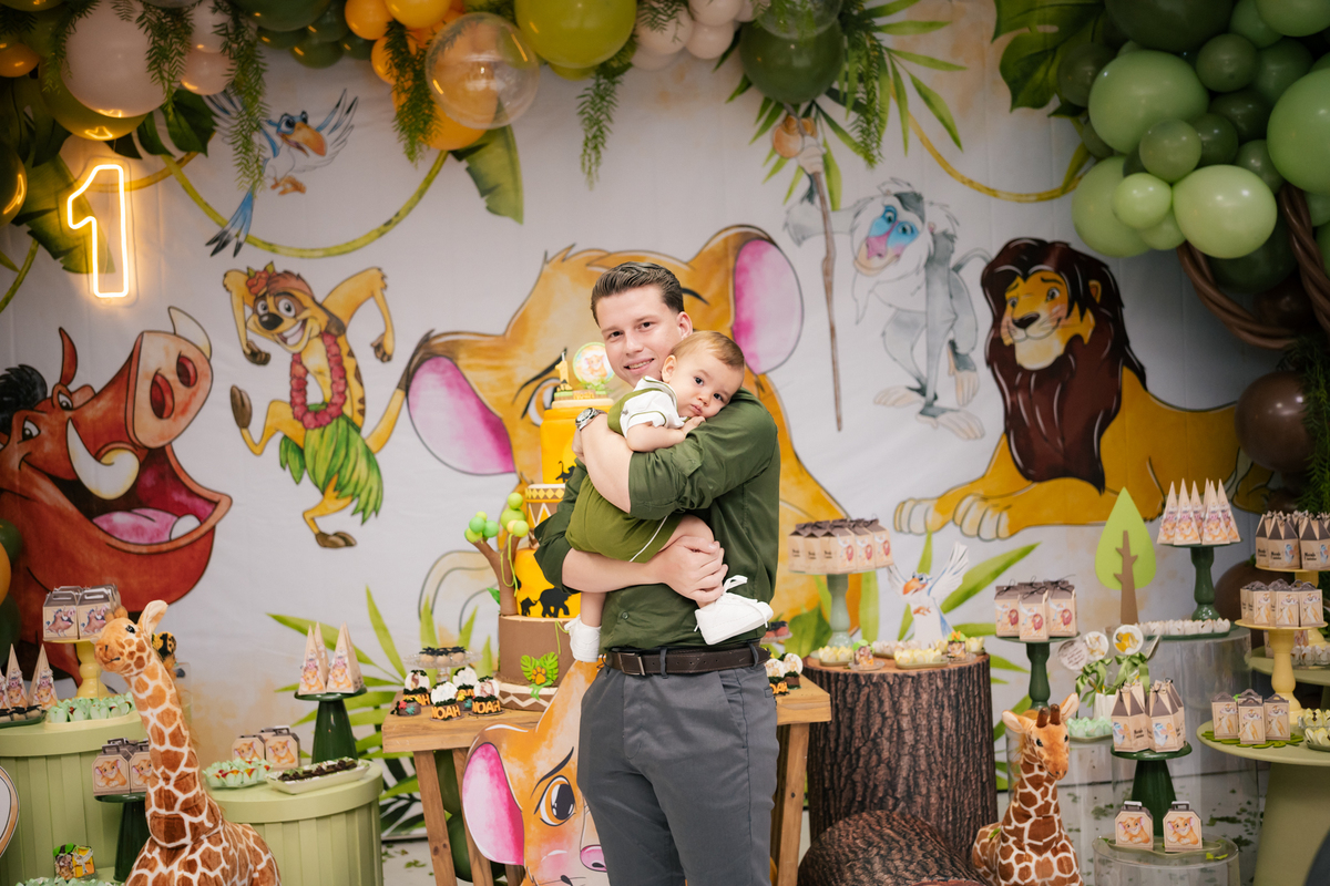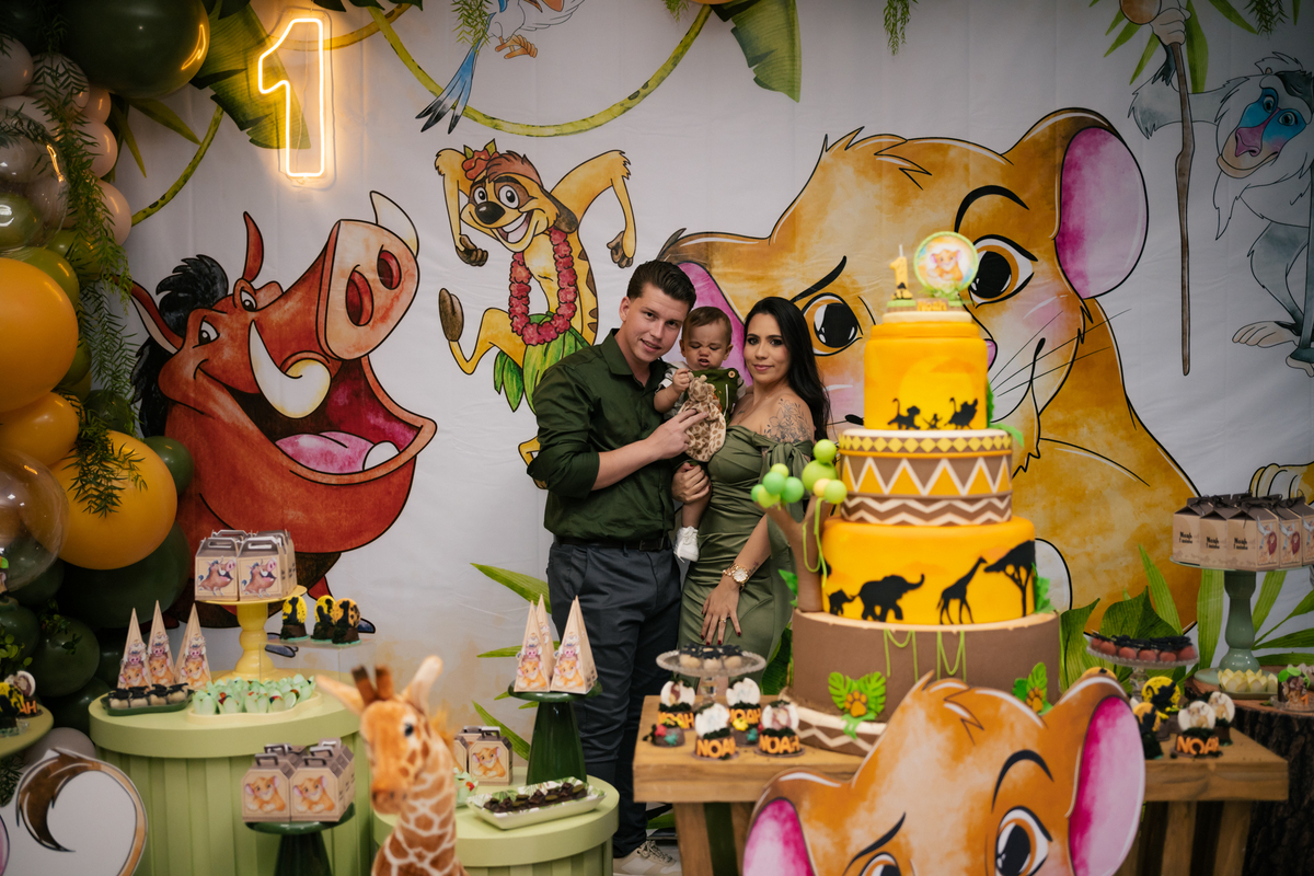 A decoração trouxe o tema Rei Leão, criando um ambiente lúdico e cheio de personalidade para comemorar o primeiro aniversário do Noah. Cada detalhe foi pensado com muito amor, transformando a festa em um verdadeiro cenário de alegria, cores e diversão para as crianças.